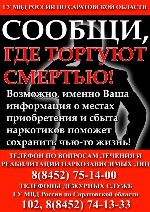 Информацию о незаконном обороте наркотиков можете сообщить по телефонам дежурных частей Главного управления МВД России по Саратовской области (102, 741-333). | |