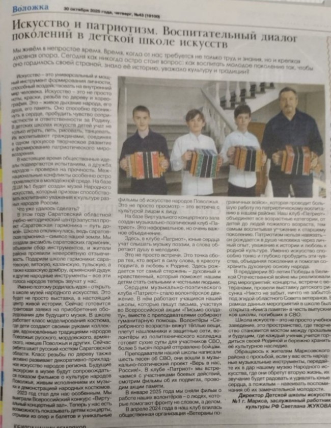 Обращаюсь к жителям Марксовского района с просьбой, если у вас есть народные музыкальные инструменты, передайте их в дар нашему музею Народного искусства, где они обретут вторую жизнь, их звучание будет радовать и удивлять юные сердца, а пожилым навеивать воспоминания об их замечательной молодости.
