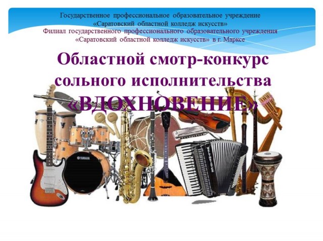 20 апреля 2024 года состоялся областной конкурс сольного исполнительства «Вдохновение - 2024». Учредитель смотра-конкурса - ГПОУ «Саратовский областной колледж искусств», организатор - филиал ГПОУ «Саратовский областной колледж искусств» в г. Марксе.